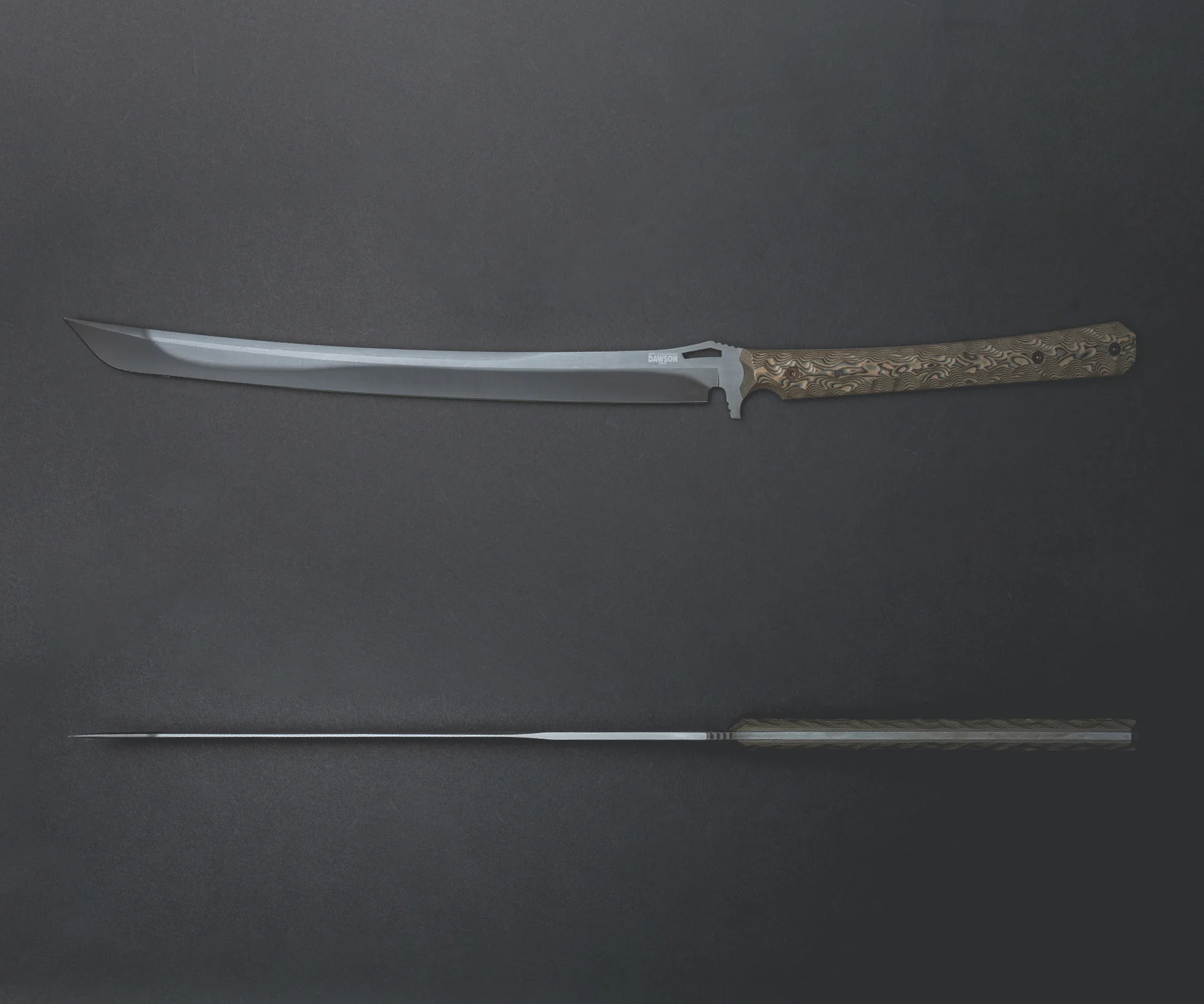 The Dawson hamon is the visual representation of an elite, differentially-hardened heat treatment inspired by the master swordsmiths of ancient Japan. The dark area along the edge is the hardest (Rockwell C 63-64) part of the blade, and the lighter area on the flat and spine is tempered much softer (Rockwell C 20-25). This produces a superior blade with exceptional lateral strength, edge sharpness and retention, and impact shock resistance.